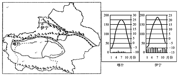 材料二 新疆区域简图(左图)和喀什、伊宁气温与降水量图(右图)。