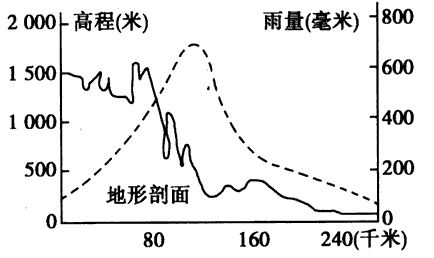 ? 大暴雨量的地区海拔约为______________米。该线附近易形成特大暴雨的原因是什么?