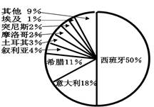 2、单选题 读“某年世界橄榄油生产国产量比例比较图”,完成问题。
