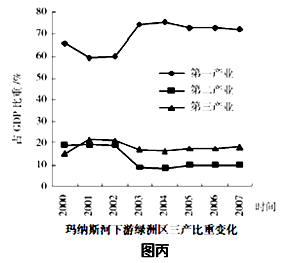 材料三:玛纳斯河下游绿洲区三大产业比重( 图丙 )。