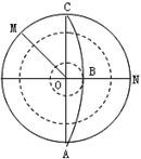 5、综合题 读南极为中心的投影图,下图中最外圈为赤道,虚线表示回归线与极圈,AB代表晨线,OM、ON为日期分界线,∠MOC=450,回答下列问题。(9分)