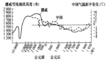 3、综合题 读“10000年来挪威雪线高度和近5000年来中国气温距平变化图”,回答下列问题。