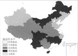 2、单选题 读“我国区域自然灾害脆弱性水平划分图”,广东、江苏两省自然灾害水平属于轻度脆弱地区的最主要影响因素是