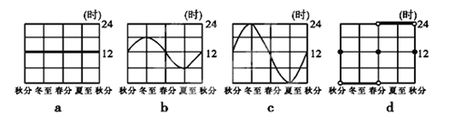 小题1:本题考查昼夜长短。根据a地终年昼长12小时,判断为赤道。B地冬至日昼最长夜最短,判断b位于南半球中纬度;c地冬至日昼最长,且为极昼,判断为南极圈;d地春分到秋分,半年极昼,秋分到春分,半年极夜,表示北极点。