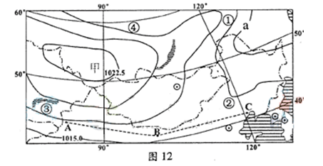 (1)在图12所示气压形势下,a等压线的数值为 百帕,①地可能出现的风向是 。若甲天气系统中心气压值增大,几天后长江中下游地区出现寒潮天气,在此期间,②地的气压和天气变化状况是 ?。