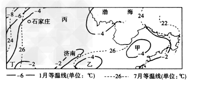 1.造成甲、乙两地1月等温线闭合且数值低于周边的主要因素是: