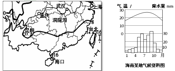 3、综合题 (10分)读我国部分地区等温线分布图和海南岛某地气候资料图,回答下列问题。?