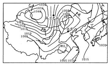 小题1:图中甲、乙、丙、丁四个箭头能正确表示当地风向的是(?)