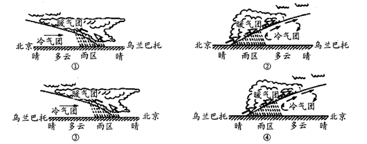 小题2:沿乌兰巴托一北京一线所作的天气系统垂直剖面示意图正确的是(?)