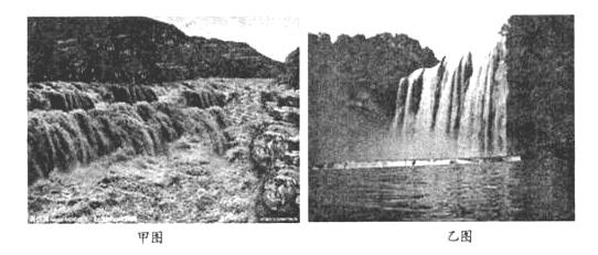下图为我国两个著名瀑布的景观图,甲瀑布(36°N,110°27′E)远远望去呈明显的金黄色,尤其在春、秋季节更显得气势磅礴;抬头望去乙瀑布(26°N,105°40′E)则如白练悬峰,娟秀清丽,无明显的季节变化。读图回答下列问题。