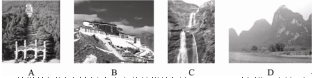 2、综合题 下列一组景观图分别是A南京中山陵、B布达拉宫、C庐山三叠泉瀑布、D广西漓江。读图,完成下列问题。