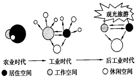 4、单选题 ? 人们日常活动空间,大体可分为居住、工作、休闲三类,每一类活动的空间规模与当地社会经济的发展息息相关。下图表示从农业时代、工业时代向后工业时代演化过程中,居住空间、工作空间、休闲空间的变化情况,读图,完成(1)——(2)题。