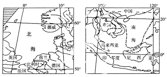 4、综合题  读下面两幅世界某区域图,回答下列问题。