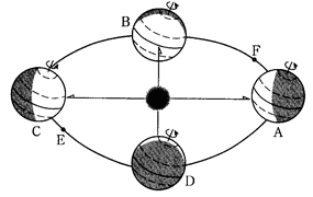 1、综合题 读“地球的公转”图,图中字母表示地球在公转轨道上的位置(阴影部分表示夜半球,如C处北极圈内出现极昼现象),请用字母回答:(6分)