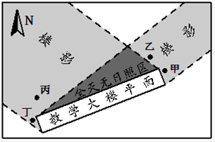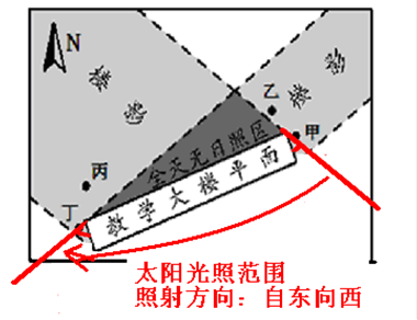 【小题1】仔细读图,注意图中指向标,可知图中教学大楼的走向是西北—东南方向,根据大楼后全天无日影区可以画出太阳光线照射范围,及其太阳光线的移动方向,如下图,可以发现该日最早接受光照的是甲、乙,然后是丁,最晚接受到日照的地点是丙,故选项C正确。