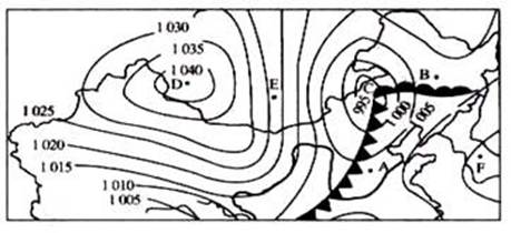 (3)B是东北风(1分)其性质干燥(1分); C是西南风 (1分);其性质温和湿润(1分)。
