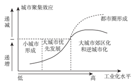5、单选题 下图示意工业化、城市化与城市聚集效应的关系。读图,完成下题。