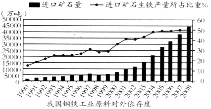 1、单选题 据《汉堡晚报》网站2011年3月16日报道,2010年全球共产钢14.1亿吨,较2009年增长16.8%。2010年中国以绝对优势稳居世界第一产钢国,产量近6.3亿吨,占全球钢产量44.3%。目前中国钢铁产能过大,产能高达6.6亿吨,国内市场需求仅为4.7亿吨。下图为中国钢铁原料对外依存度变化统计图,据此回答下列各题。