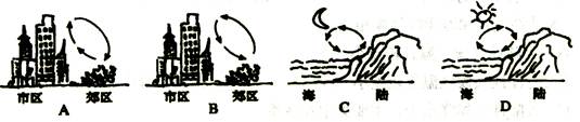 本题解析:热力环流的基本特征:“热空气上升,冷空气下沉”,故城市热岛效应,市区形成上升气流,郊区为下沉气流,形成环流,故A正确;晚上的海陆之间,陆地气温较海洋低,故陆地上应为下沉气流,海洋上形成上升气流,C错误;白天的海陆之间,陆地气温较海洋高,故陆地应为上升气流,海洋上形成下沉气流,D错误。