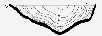小题2:若该剖面图位于长江口附近,M为北岸,河口中一岛屿将长江口分①、②两河汊,则