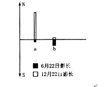 1、单选题 a、b两城夏至日和冬至日正午旗杆(等高)的影长及朝向如图,据此回答问题。