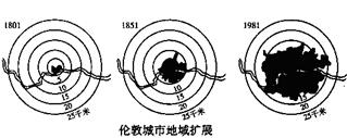 4、单选题 读“伦敦城市地域发展示意图和城市人口变化示意图”,回答36题。