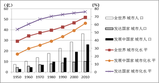 3、综合题 读1950-2010年世界城市化进程示意图,回答下列问题。(10分)