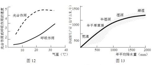 3、单选题 净初级生产量指在初级生产过程中,植物光合作用固定的能量中扣除植物呼吸作用消耗掉的那部分能量。图12为光合作用、呼吸作用随气温变化图,图13为净初级生产量随雨量变化图。完成以下问题。