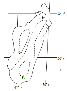 【小题1】根据经纬度和岛屿轮廓可以确定该岛屿是非洲的马达加斯加岛。根据所学过的知识,该岛受地形、暖流、东南信风的影响,东侧迎风坡形成高温多雨的热带雨林气候、西侧背风坡形成热带草原气候,所以该岛东侧降水量多于西侧。排除D选项,因为图中等值线若反映的是年降水量,必然有东多西少的空间规律,而图中几条等值线反映不出东多西少的空间规律;该岛东侧阴雨天多、西侧晴天多,所以西侧的年日照时数应该多于东侧,图中几条等值线没有反映出这样的空间规律,排除A选项;同学们知道,随纬度增加,气温逐渐降低,该岛从北向南,纬度逐渐增加,所以从北向南该岛的气温也应该是逐渐降低,题干指出a>b=c>d,与实际气温分布吻合,c线向低纬弯,说明气温低,地势高,这与实际的地形(山地)又非常吻合,所以C选项正确。