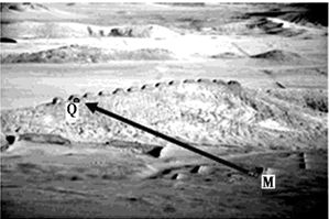 1、单选题 昌克罗十三塔位于秘鲁沿海沙漠地带的一座矮山山顶,呈南北方向排列,每座塔东西两侧各有一个观测点。2012年6月20日6时28分(地方时)在Q观测点看到太阳在M点方向的地平线上,2012年夏至日为6月21日。读图完成下列问题。