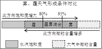 1、单选题 雾与霾的形成均与大气中的微粒(凝结核)和水汽相互作用有关,城市大气中的微粒主要来自于机动车尾气和工业生产排放,结合下图可知