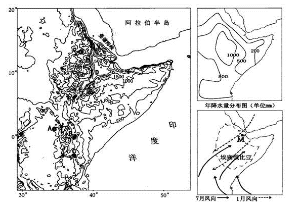 (2)读图,M地纬度较低,终年炎热,受埃塞俄比亚高原阻挡,夏半年M处位于湿润的西南季风的背风坡,是雨影区,降水少。冬半年,从阿拉伯半岛沙漠地区吹来的干燥的东北信风,气温上升,水汽不易凝结,降水稀少,形成热带沙漠气候。