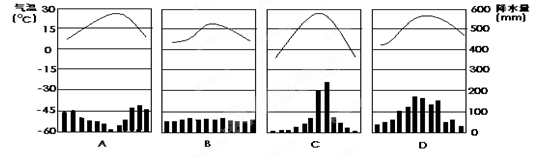 本题考查世界主要气候类型的成因与分布。南北纬30°-40°的大陆西岸,由气压带和风带交替控制形成的气候类型是地中海气候,地中海气候最大的特点是雨热不同期。图中A雨热不同期,为地中海气候。所以本题选择A选项。