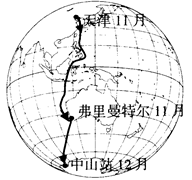 5、单选题 北京时间2011年11月3日11时,中国南极科考队乘坐“雪龙号”科考船从天津港启程,执行我国第28次南极科考任务。读图完成30~32题。