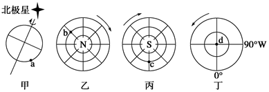 本题解析:根据图示中心极点为北极,故自转方向呈逆时针,从d点看b点与自转方向相反,为向西,A错误;a点距离北极点较d点近,故a点纬度较高,B错误;c点距离北极点较b点近,故c点位于b点的北面;从b点看c点,与自转方向一致,故c点位于b点的东面,故C项正确;a点纬度较b点高,故a点昼夜长短变化幅度较b点大,D错误。