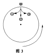 1、单选题 图3中的圆圈表示地球的赤道,圆心表示极点,圆圈外的箭头表示地球自转的方向。当从甲地向极点方向发射导弹时,导弹前进的方向最有可能的是