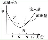 【小题1】 一般来说,水库的水量收入由盈转亏时储水量最大。据图可知:该地 6 月份流入量最小,12 月份流入量最大,说明此地 12 月份为雨季强盛期,而水库储水量最大应为雨季降水将近结束,而水库流出量相对较少的时期,乙时期流入量正好等于流出量,此时水库的储水量最大,所以本题B正确。