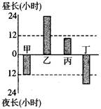 4、单选题 如右图为某日甲、乙、丙、丁四地的昼长或夜长示意图。读图回答下列各题。