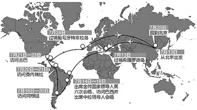 1、单选题 读“2014年习近平主席拉美之行”示意图,回答下列各题。