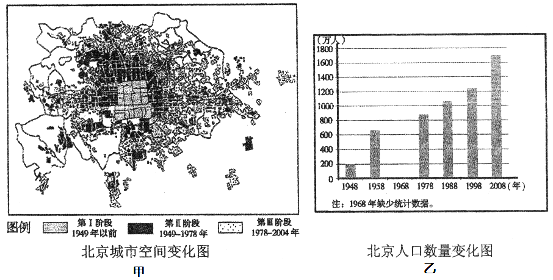 (1)读甲图,指出第Ⅱ、Ⅲ阶段北京城市空间发展最快的方向分别是:第Ⅱ阶段?,第Ⅲ阶段?。(2分)