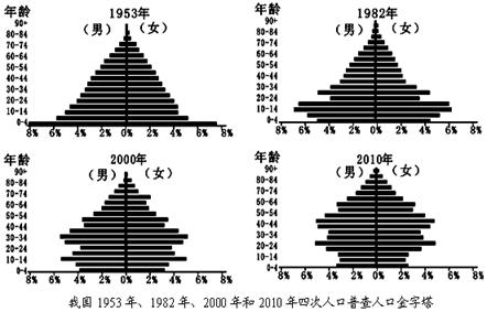 5、综合题 读 “我国四次人口普查金字塔图”,完成下列问题。(8分)