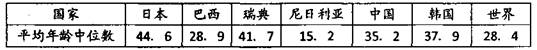 材料三:年龄中位数指将全体人口按年龄大小的自然顺序排列时居于中间位置的人的 年龄数值。年龄中位数是一种位置的平均数,它把人口分为两个数目(按年龄)相等的部 分,一半在中位数以上,一半在中位数以下。下表示意2010年部分国家及世界人口平均年龄中位数(单位:岁)