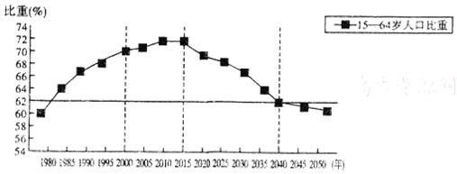 5、单选题 下图为中国劳动适龄人口(15~64岁)比重预测图,读图回答1~2题。