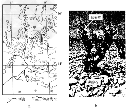 成熟的光照及昼夜温差与其糖分积累呈正相关。图a中甲、乙两地均为优质葡萄产地。图b为乙地典型的葡萄种植园景观。世界上酒精度最高(16.2度)的优质葡萄酒就是使用乙地及其附近所产的葡萄酿制而成的。