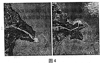 2、单选题 图4为 我国北方某河流入海口1989年和2009年的卫星形象。该河口区河流干流曾于1996年人工改道。读图回答第2题。