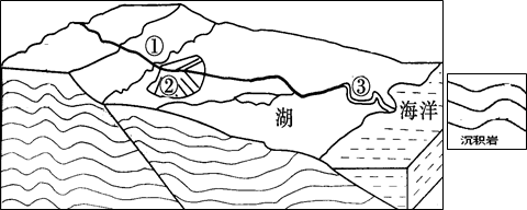 小题1:图示①位于河流上游,落差大,故以流水的侵蚀作用为主,②为山麓冲积扇,是流水沉积作用而形成的地貌;③为河口三角洲,属于流水沉积作用而形成的地貌。