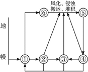 【小题4】下图是“三大岩石关系示意图”,图中数码①~⑥所代表的内容依次是 ( )