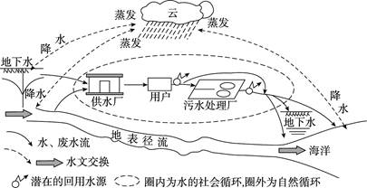 1.从图中可以看出圈内为水的社会循环,包括供水厂、用户、污水处理厂等。水的社会循环是指在水的自然循环当中,人类不断利用其中的地下径流或地表径流满足生活与生产之需而产生的人为水循环。可见水的社会循环是在水的自然循环基础的人为参与,它不包含水的自然循环。水的社会循环主要改造的是地下径流或地表径流,有时会加速水的自然循环,有时也会制约水的自然循环,因此对陆地水的更新有时有促进作用,有时有延缓作用。由于水的社会循环是为了满足生活与生产之需,因此其对水的自然循环会造成负面影响,如水污染、水的浪费现象等。