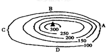 2、单选题 读下图,从山峰向下望,将不能看见的点是
