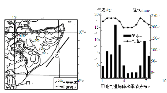 4、综合题 下面左图为世界某区域简图,右图为区域内甲处气温与降水季节分布图,读图回答。